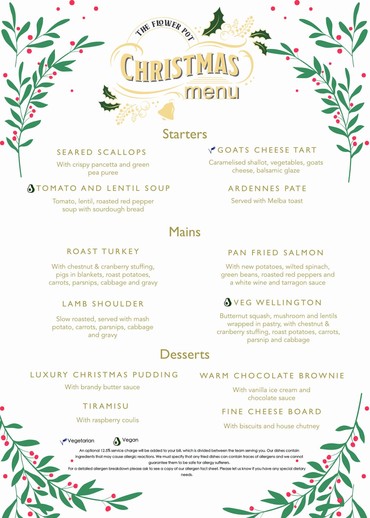 Christmas Party menu is only available by pre-booking. A non–refundable £15 deposit per person is required to confirm the booking. A pre-order must be given by 11th December. A discretionary 12.5% service charge will be added to your bill of which 100% goes to the team serving you. Our dishes contain ingredients that may cause allergic reactions. For a detailed allergen breakdown please ask to see a copy of our allergen fact sheet. Please let us know if you have any special dietary needs.